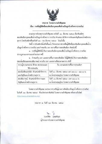 - ประกาศ รับสมัครสอบคัดเลือกบุคคลเพื่อจ้างเป็นลูกจ้างชั่วคราวเงินบำรุง (รายวัน) ตำแหน่ง พนักงานช่วยเหลือคนไข้ จำนวน 1 อัตรา