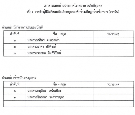 - ประกาศ ผลการสอบคัดเลือกลูกจ้างชั่วคราวรายวันตำแหน่ง นักวิชาการสาธารณสุข